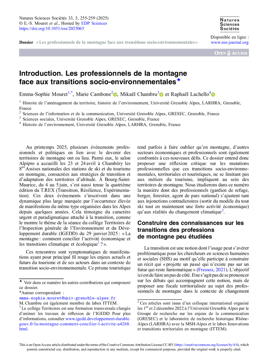 Dossier « Les professionnels de la montagne face aux transitions socio-environnementales » – Introduction. Les professionnels de la montagne face aux transitions socio-environnementales★